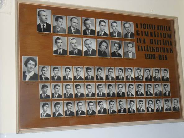 Látszólag össze-vissza kószálunk a folyosókon, pedig erről szó sincs. Minden emlékeztet valakit valamire. A vitrinekben például ott vannak a keszthelyi Helikon serlegei, amiknek a megszerzésében társaimnak is része van. Az első emeleten megtaláljuk a tablónkat. Hála neked iskolánk, hogy még mindig kitüntető helyen függ. Már nem Csapó Jenő bácsi vezeti a tanári kart, mert egy évvel az érettségink előtt nyugdíjba ment, de a jelenléte nélkül is tudjuk: neki köszönhetjük kitűnő tanárainkat. Sem Ő, sem az akkor már az iskolát vezető Kanarás Oszkár igazgató úr nem tanította osztályunkat. De Paál Lajos tanár úr igen. Hétfő reggeli kedve a VT-Vasas (ma Videoton) futball csapat eredményétől függött. Csak rá jellemző hajkoronájával „beviharzott” a terembe, a reggeli sportlapot a tanári asztalra dobta, félmondattal méltatta az eredményt, majd valami hihetetlen lenyűgöző élvezettel magyarázta a francia impresszionisták költészetét, mondván Radnótit a könyvből is meg tudjátok tanulni. Még végig sem gondolhatom Paál tanár úr igazi nagyságát – ez is otthonra marad – valakitől már a Madárvárta történetét hallom, ami Radeczky Jenő tanár úr biológia tanár, különös madárszeretetéről szól. Kitüntetés volt számunkra, ha elmehettünk vele egy madár lesre. Talán csak a tablón látjuk Schermann Ede tanár urat öltönyben, hiszen az nem illik bele a tornatermek hangulatába. Nem volt már húsz éves, mégis őket megszégyenítő módon szelídítette meg a korlátot, a gyűrűt vagy a lovat, ha egy gyakorlatot meg akart mutatni az ügyetlenkedő tanulónak. Németh Pál tanár úr matematikája pontosan elég volt egy humán osztály számára, de amit ipari rajzból adott, sokunk számára egészen új volt. A hivatalos besorolás szerint orosz-humán tagozatos osztály voltunk. Nem volt velünk könnyű dolga Albert Józsefné Renner Ida tanárnőnek. A mai nyelvtanárok számára elképzelhetetlen, hogy egy tagozatos osztályba 41 tanuló jár. Számára azonban mindez nem megoldhatatlan feladatot, hanem kihívást jelentett. Negyedikben Tóth Gézáné tanárnő váltotta Őt, másik iskolába ment. Meg voltak az alapok a sikeres folytatáshoz. Tanultunk lélektant és logikát Palotás Istvánné Kimmel Ilona tanárnőtől.