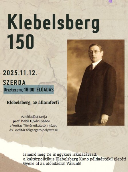 Klebelsberg 150 Ismerd meg Te is egykori iskolatársad, a kultúrpolitikus Klebelsberg Kuno példaértékű életét! Gyere el az előadásra! Várunk! 2025.11.12. SZERDA Díszterem, 16:00 ELŐADÁS 2025.11.10