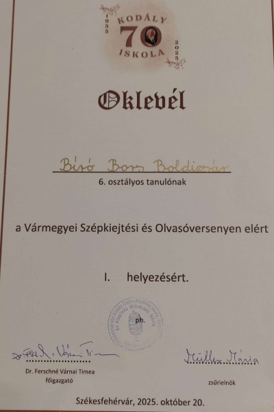 Szépen magyarul Bíró Bors Boldizsár 6.b osztályos tanulónk újabb anyanyelvi versenyen vett részt. Ezúttal a Fejér Vármegyei Szépkiejtési és Olvasóverseny első helyezettje lett. Gratulálunk! 2025.11.23
