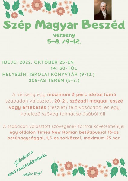 Szép magyar beszéd verseny Az október 25-én megtartandó versenyünk részleteit a plakátra kattintva lehet elolvasni. 2022.10.16
