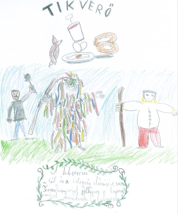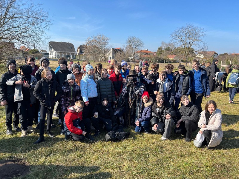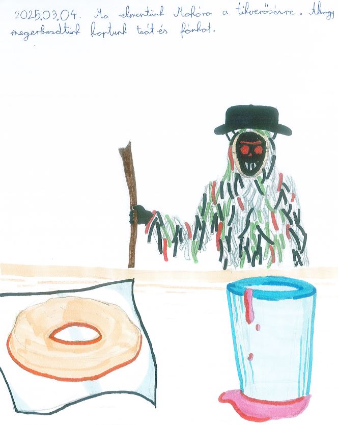 2025. március 4-én az 5.a és az 5.b osztállyal elindultunk Mohára megnézni a Tikverőzést. Megérkezésünk után egy nagy ház udvarába mentünk, ahol finom fánkkal és teával kínáltak minket. Az színpadon már ott állt a szalmatörök, aki kitömött fehér ruhában volt, a kéményseprő és a két lánynak öltözött fiatal legény.
