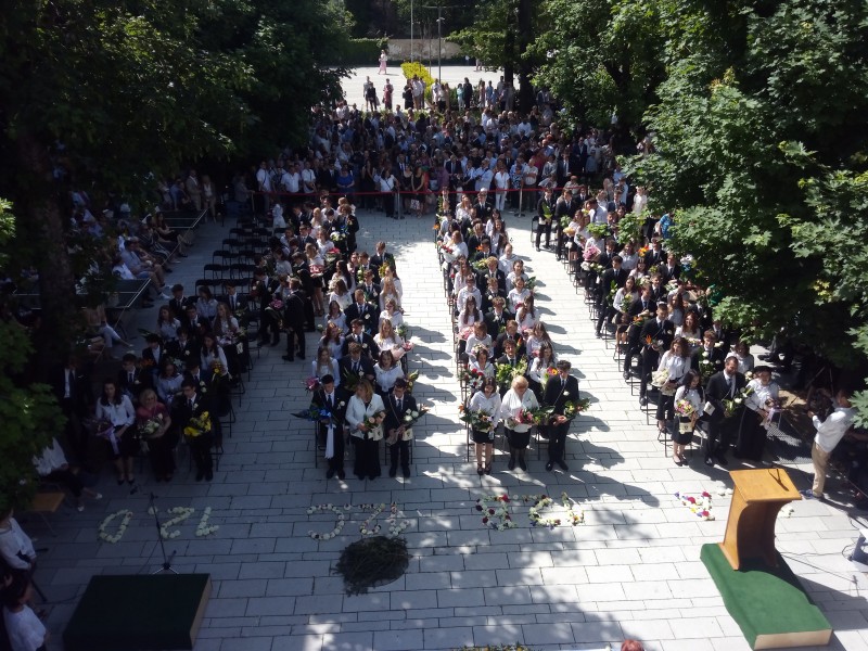 A ballagók a virágba borult iskolában folytatták útjukat, ahova sorfalat álló diáktársaik és tanáraik közt vonultak be egészen az osztálytermükig, ahonnan kis megpihenés után a gimnázium zászlóját követve ismét útra keltek, hogy bejárják a folyosókat és elhaladjanak a tantermek előtt, ahová annyi kedves emlék, élmény, barátság és öröm is kötötte őket, melyek azért megédesítették a hétköznapi munka kihívásait, nehezebb pillanatait is. A menet végül a díszudvaron ért célba, ahol várták már őket az összegyűlt szülők, pedagógusok és az iskola vezetősége is, hogy megkezdődhessen az ünnepség napfényes, szabadtéri záró akkordja.
