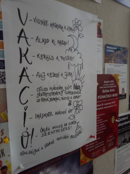 A hálaadó szentmise nyitó áldásakor Előd atya kiemelte, hogy ennek az együttlétnek kettős célja van: egyrészt köszönetet mondunk az Atyának az egész évért, másrészt válaszokat keresünk a kérdésre, hogy „mihez kezdjünk az előttünk álló vakációvak?”, hogy a szünidőben is épüljünk, erősödjünk. Az evangéliumhoz fűzött tanításában iskolánk spirituális vezetője kiemelte, hogy a hála és a szeretet része, hogy „minden, ami jó volt, odaadom neked, Uram!”, és a valódi hálaadás feltétele, hogy észreveszem a jót, ami velem történik a mindennapjaimban. Előd atya megfogalmazta azt is, hogy „a vakáció egy próbatétel”, olyan kaland, ahol a gyakorlatban is ki lehet próbálni, amit a tanév során elméletben megtanultunk. Elhangzott egy bátorítás is, hogy a szünidőt a három dimenzió jegyében tegyük értékessé: legyen jelen egyaránt a szélesség, a hosszúság és a mélység is mindennapjainkban. A szélesség, azaz járjunk nyitott szemmel és nyitott szívvel ebben az országban, ami annyi természeti és kulturális kincset tartalmaz, és ne csak átrohanjunk a látnivalókon, hanem igyekezzünk valóban befogadni azokat; a hosszúság, azaz ne csak a pillanatot zabáljuk, hanem mindig legyünk tudatában a jövőnek, (az Egek felé szárnyaló) céljainknak, ugyanis aki ezekkel tisztában van, csak az lehet igazán boldog ember; a mélység, azaz szánjunk időt az elcsendesedésre, akár a természetbe is kivonulva, hogy Isten csodáit megismerve épülhessen kapcsolatunk a Mennyei Atyával. A szentmisét lezáró áldásában Előd atya, mintegy összefoglalva az elhangzottakat, egy új értelmet, új jelentést adott a vakációnak.