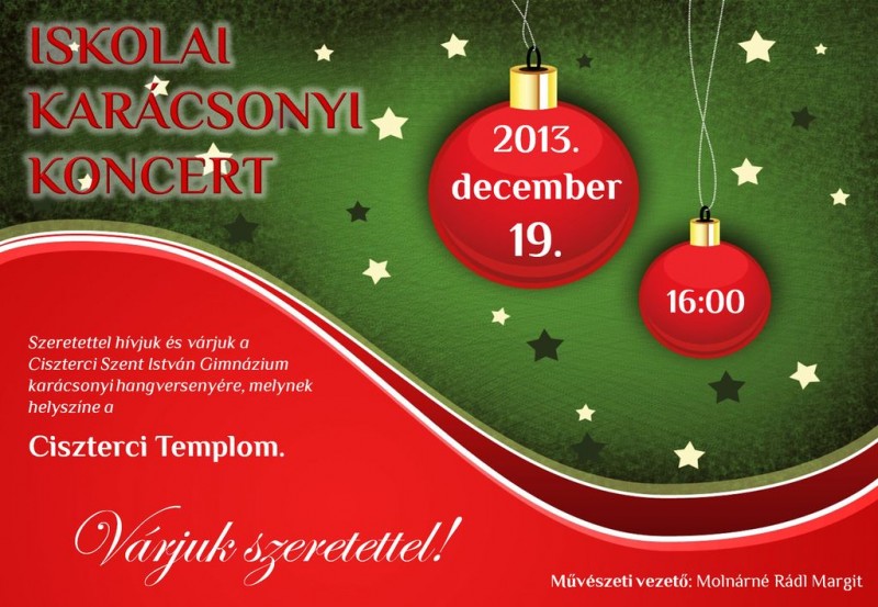 Iskolai Karácsonyi Koncert Szeretettel hívjuk és várjuk a Ciszterci Szent István Gimnázium karácsonyi hangversenyére, melynek helyszíne a Ciszterci Templom. 2013. december 19. 16 óra. 2013.12.16