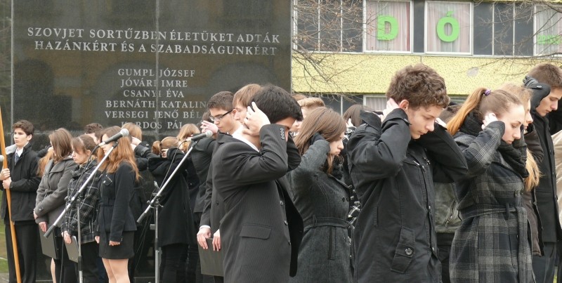 Gimnáziumunk 11. b osztályának tanulói a kommunista terrort testközelből ismerő, elszenvedő kortársak beszámolóiból, szövegrészleteiből állították össze megemlékező műsorukat, amelyet február 25-én Vargha Tamás honvédelmi államtitkár beszédét követően adtak elő a székesfehérvári 56-osok terén.