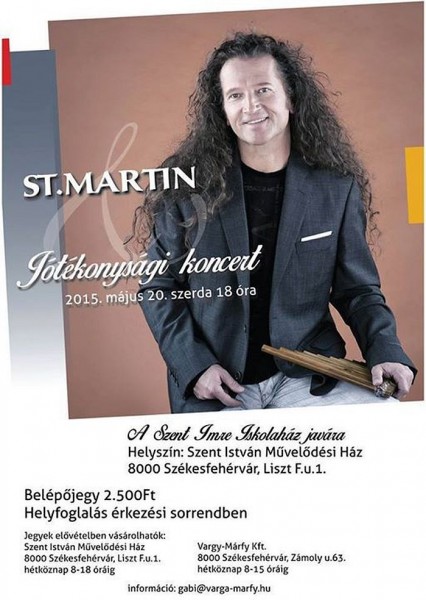 St. Martin előadóművész, zeneszerző jótékonysági koncertet ad a fehérvári Szent Imre Iskolaház javára a Szent István Művelődési Házban május 20-án szerdán 18 órakor. St. Martin nemcsak muzsikájával, hanem fotóival és verseivel is kifejezi azt a belső világot, ami dallamaiban is testet ölt.