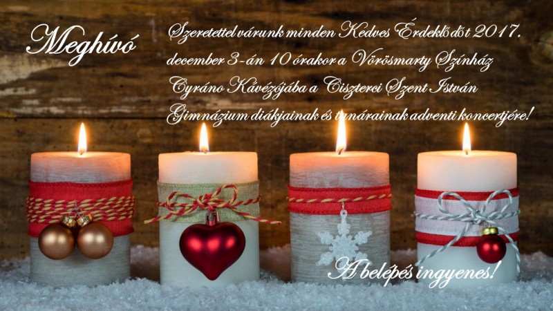 Szeretettel várunk minden Kedves Érdeklődőt 2017. december 3-án 10 órakor a Vörösmarty Színház Cyráno Kávézójába a Ciszterci Szent István Gimnázium diákjainak és tanárainak adventi koncertjére!