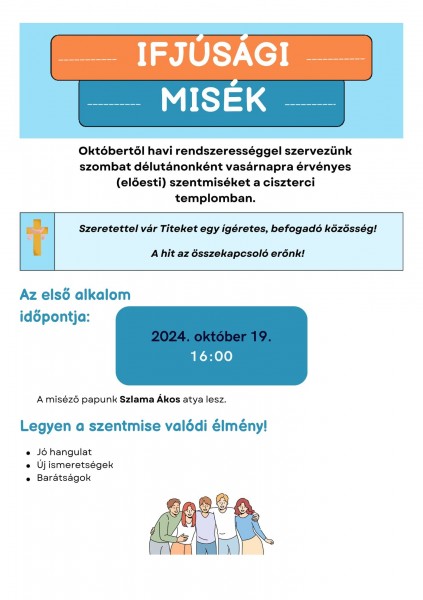 Ifjúsági misék Októbertől havi rendszerességgel szervezünk szombat délutánonként szentmiséket a ciszterci templomban. Az első alkalom időpontja: 2024. október 19. 2024.10.15