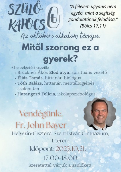 Szülő-Kapocs Az októberi szülő-kapocs témája: Mitől szorong ez a gyerek? Vendégünk: Fr. John Bayer Helyszín: Ciszterci Szent István Gimnázium 1. terem 2025.10.21 17 óra 2025.10.16