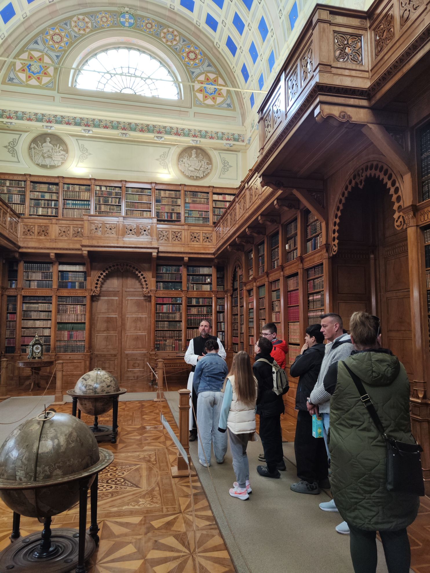 A 65 000 kötetet őrző műemlékkönyvtárban a tudomány és a kaland találkozott. A diákok ámulva figyelték a „varázsasztalt”, amely pár mozdulattal létrává alakítható, hogy a legfelső polcok könyveit is elérjék. A komoly gyűjtemény felett azonban egy 1944-es tragikomédia nyomai is látszanak: a mennyezet egy része ma is csak festve van, mert egy udvarló német pilóta mutatványozás közben bezuhant a könyvtár tetőszerkezetébe.