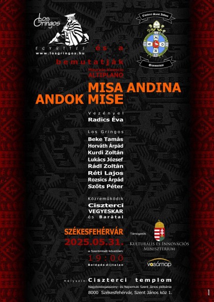 A Ciszterci vegyeskar és barátai, valamint a Los Gringos zenekar előadásában máj.31-én szombaton 19 órakor a Ciszter templomban kerül előadásra az Andok-mise. A belépés díjtalan. Reméljük, hogy sokan eljöttök meghallgatni, a darab Magyarországon is ritkán kerül előadásra