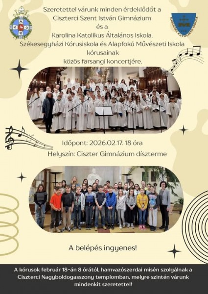 A váci Karolina Katolikus Általános Iskola és Székesegyházi kórus az iskolánkba látogat, és febr.17-én 18 órától iskolánk gyermakkarával közös koncertet adnak.
