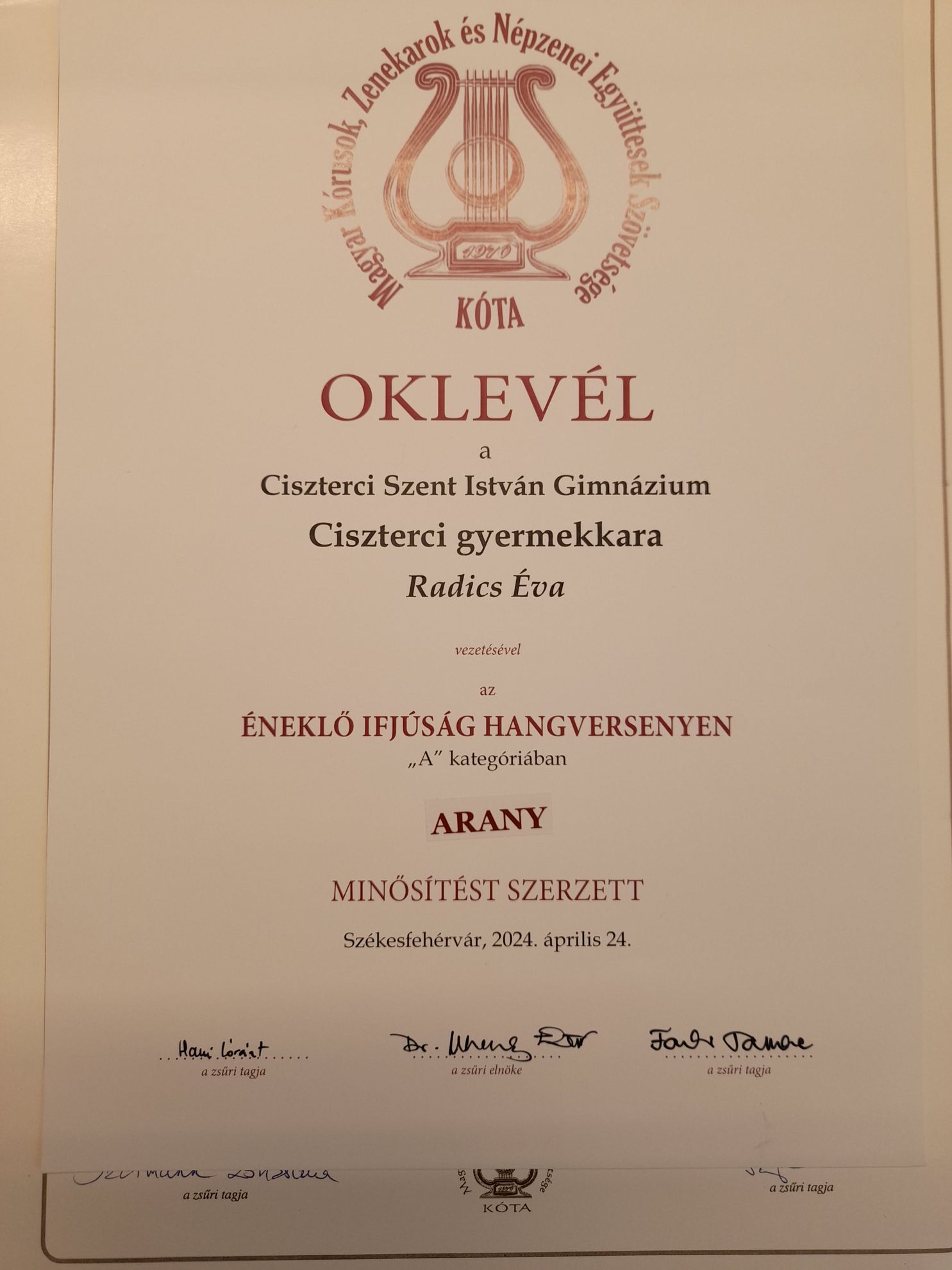 A Ciszterci Gyermekkar 2024.04.24-én arany minősítést szerzett az Éneklő Ifjúság Minősítő Hangversenyen.