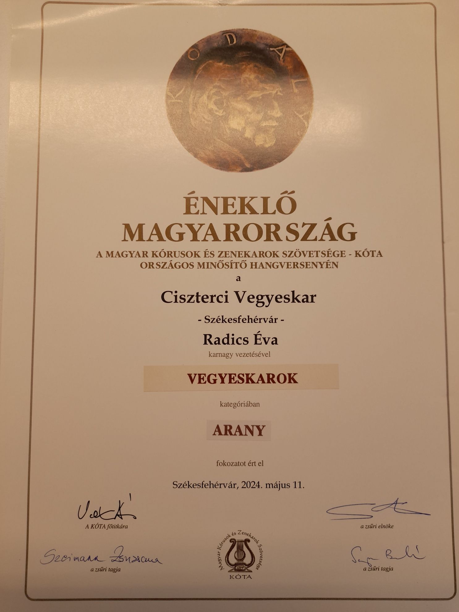 A Ciszterci Vegyeskar 2024.05.11-én arany minősítést szerzett a Szent István Városa Kórusversenyen megrendezésre kerülő Éneklő Magyarország Minősítő Hangversenyen.
